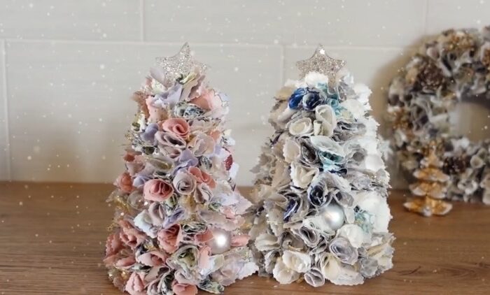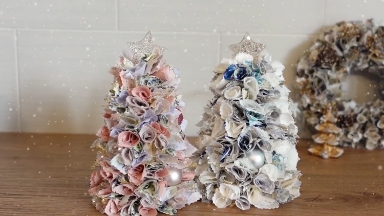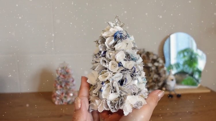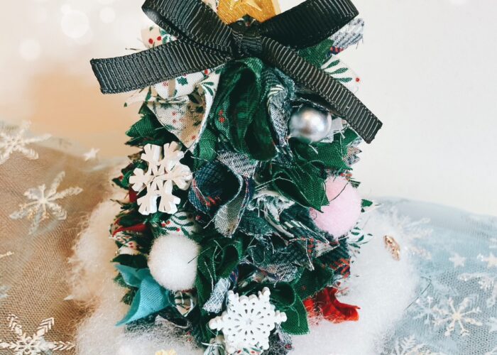 ハギレをお花のように巻いて可愛いミニツリーを作りましょう。