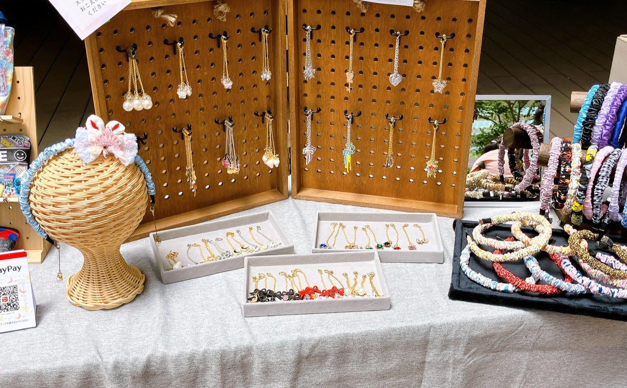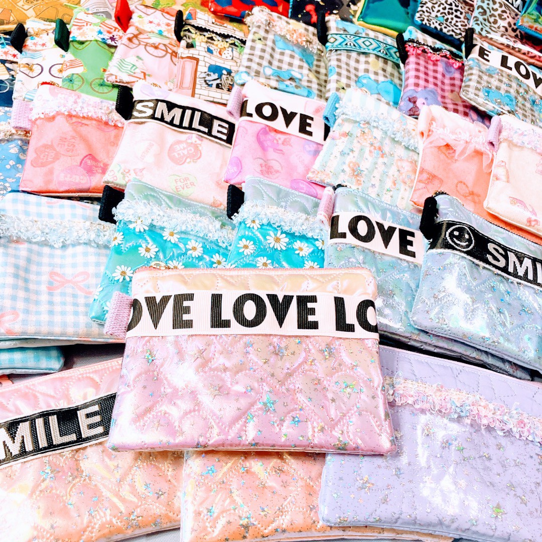 シャカシャカポーチ…様々な柄のハンドメイドポーチにお好きなパーツを詰め込んで自分だけの世界を作れます。キーホルダーとチェーンを繋げてカバンやボトムスにつけれる便利アイテム🎵