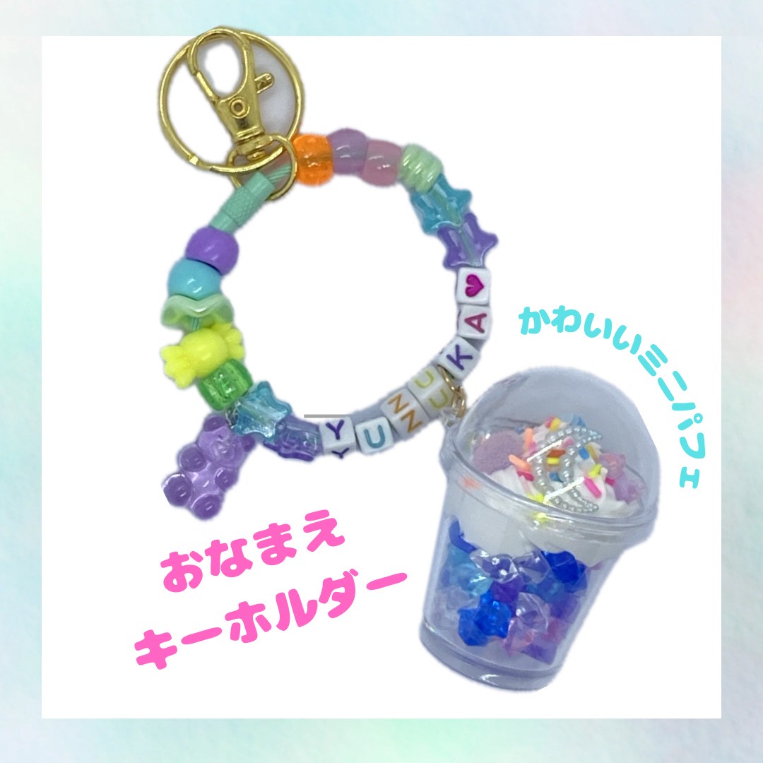 ミニパフェキーホルダーはお名前も入れられますよ♫たくさんの種類のパーツから選んで、自分だけのオリジナル作品を作ってみてくださいね!