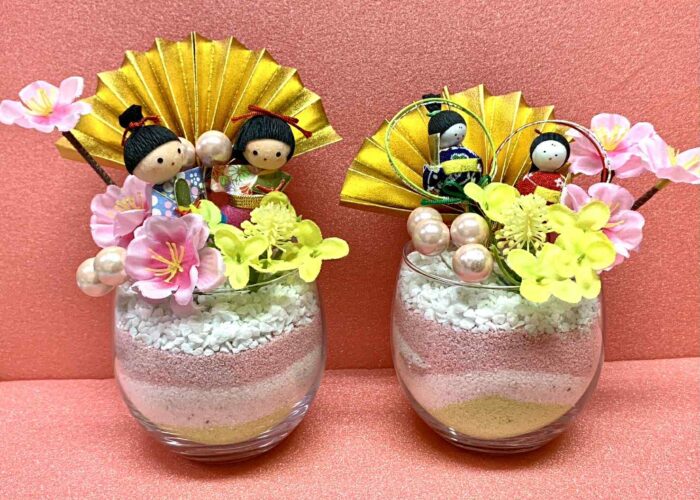 ひな祭りカラーの砂を重ねて、思い出として飾れる記念のグラスサンドアートを作るワークショップです。