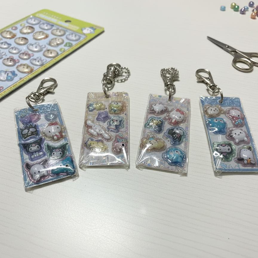 自分だけのオリジナルキーホルダーが完成します。親子で気軽に楽しめる、今人気のシールクラフト体験です。